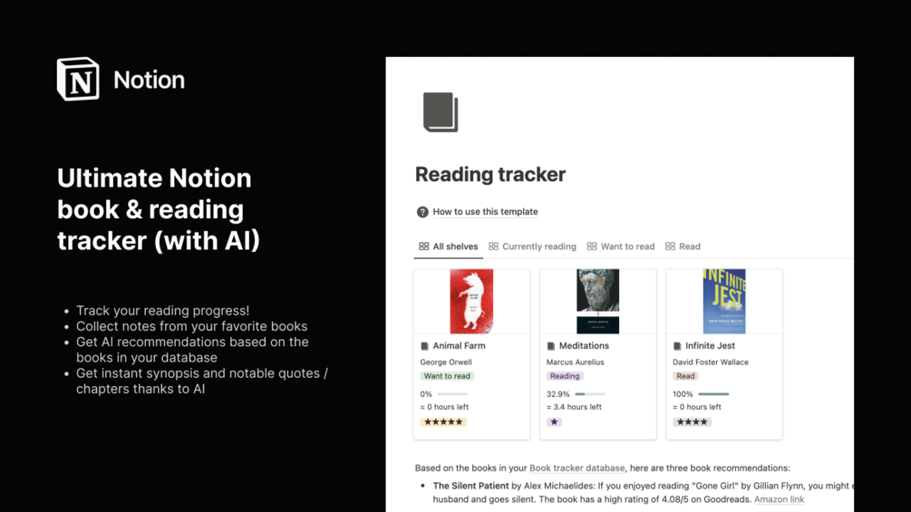 If you're a bookworm and Notion user, this template is for you! It enables you to: